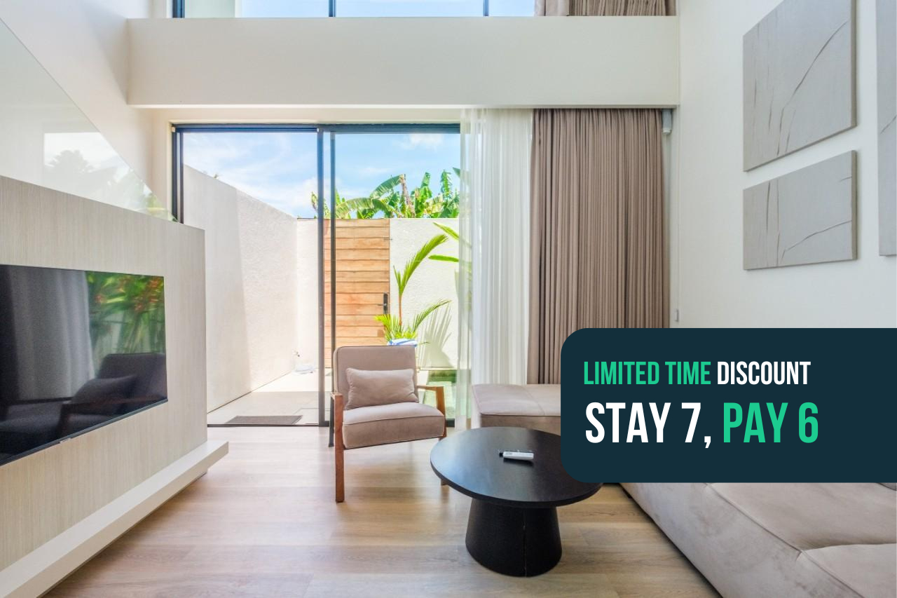 Step into a world of refined indulgence and modern luxury at the Smart Oasis Villa 3, nestled in the serene paradise of Berawa, Canggu. Here, time passes slower, the air is fresher, and your private pool luxury getaway in Bali awaits. Just a short seven-minute bike ride from the rolling waves of the Indian Ocean, this prestigious villa rental in Bali offers you not just accommodation, but an unforgettable experience of style, comfort, and tranquillity. From the moment you arrive, you will be enchanted by the combination of modern architecture in pastel colours and the beauty of the tropical plants throughout the private pool sanctuary in Bali. Here with every step inside, you’ll encounter an ambiance designed to inspire and delight. The villa exudes a modern flair with an unmistakably warm and inviting atmosphere. The open plan living room has plenty of space for everyone, making it the perfect gathering place for friends, family or couples. Staying in this poolside Bali villa for rent, relax in air-conditioned comfort on the plush oversized sofa and immerse yourself in your favourite entertainment on the sleek Smart TV. Automated electric curtains add a high-tech touch, changing the mood of the room with effortless ease. This Bali villa with a fully equipped kitchen will awake your inner chef, whether you're preparing a gourmet meal or a cup of coffee to start your day. With an induction hob, microwave, fridge and a range of kitchen utensils, everything you need for cooking and eating is at your fingertips. The dining table of our Bali vacation home for families and friends adjacent to the kitchen creates a seamless flow for shared meals and meaningful conversations. Moving on to the villa's two bedrooms, each has been thoughtfully designed to provide the ultimate in comfort. Sink into the plush king-size beds covered in premium linen to ensure you wake up refreshed and energised each morning. Beauty meets functionality with ample wardrobe space for all your belongings in this five-star poolside villa in Bali. Each bedroom also has its own en-suite bathroom with walk-in showers and premium toiletries including slippers, bathrobes and complimentary amenities. One of the bedrooms of the vacation villa rental offers an extra touch of luxury: a chic sunken lounge on the terrace, ideal for cosy conversations or moments of serene solitude. For larger groups or families, two additional sofa beds — one on each floor — convert effortlessly into sleeping areas. So this Bali villa with amenities for kids or friends provides plenty of privacy for everyone. For those who need to stay connected while on holiday, there is a stylish workspace on the second floor with a desk and seating area. With high-speed WiFi available throughout our elegant Balinese villa retreat, working remotely has never been more convenient and inspiring. Whether it's an emergency conference call or an informal email exchange overlooking the tropical landscape, this space invites productivity and creativity in equal measure. The exterior of this tropical Bali villa rental is equally enchanting. At the front of the vacation poolside property, you'll be captivated by the sparkling private swimming pool, a tranquil retreat from the tropical heat. Imagine yourself plunging into the cool waters, drink in hand, surrounded by greenery. The pool area is adorned with outdoor furniture for lounging, sunbathing and soaking up the vibrant Balinese sun. Beyond the pool, the courtyard patio of the lavish Bali villa for holidays provides a tranquil haven where you can unwind in privacy to the gentle sound of rustling palm leaves. The Smart Oasis Villa 3 is equipped with everything you could possibly need, seamlessly blending futuristic convenience with personal comfort. Each room offers thoughtfully designed amenities, from drying racks and ironing facilities for those little necessities, to flat screen televisions for entertainment. Air conditioning ensures that every corner of the Bali vacation villa feels refreshingly cool, even on the sunniest of days. Indulge yourself while we take care of the details. This exquisite vacation home offers daily housekeeping to ensure your space remains immaculate throughout your stay. Laundry and ironing services are also available on request, giving you more time to enjoy the experiences Bali has to offer. Do you prefer and plan to travel with pets in Bali? Here your furry friends are welcome on request to add to the enjoyment of your stay. Your comfort and safety are paramount. This safe private villa in Bali is equipped with CCTV cameras, smoke detectors and a secure key access system to ensure peace of mind at all times. A safe deposit box is available for the safe storage of your valuables. Whether you're soaking up the sun or dozing in the comfort of your bedroom, you can relax in the knowledge that the property is well guarded. And we also invite every guest of our opulent vacation Bali villa to discover the art of effortless stays through our concierge service — a crafted collection of experiences tailored to your desires. Whether you seek serene transfers, bespoke tours, curated rentals, inspired entertainment or deliveries, our trusted staff awaits to weave each request into the tapestry of your escape. Allow us to choreograph your days and compose moments that linger — from sunrise yoga on the terrace to lantern-lit dinners, private surf lessons to hidden-gem excursions. Share your wishes, and we will paint them into your stay. Please Note: Although construction is underway adjacent to our holiday poolside villa for rent, rest assured that every effort has been made to maintain a peaceful and relaxing atmosphere for our valued guests. Our concern for your comfort remains uncompromising. And let us add a touch of exclusivity to your stay — along with the Smart Oasis vacation rental villa 3, we offer a complimentary Finns Platinum membership so you can enjoy all the luxury Bali has to